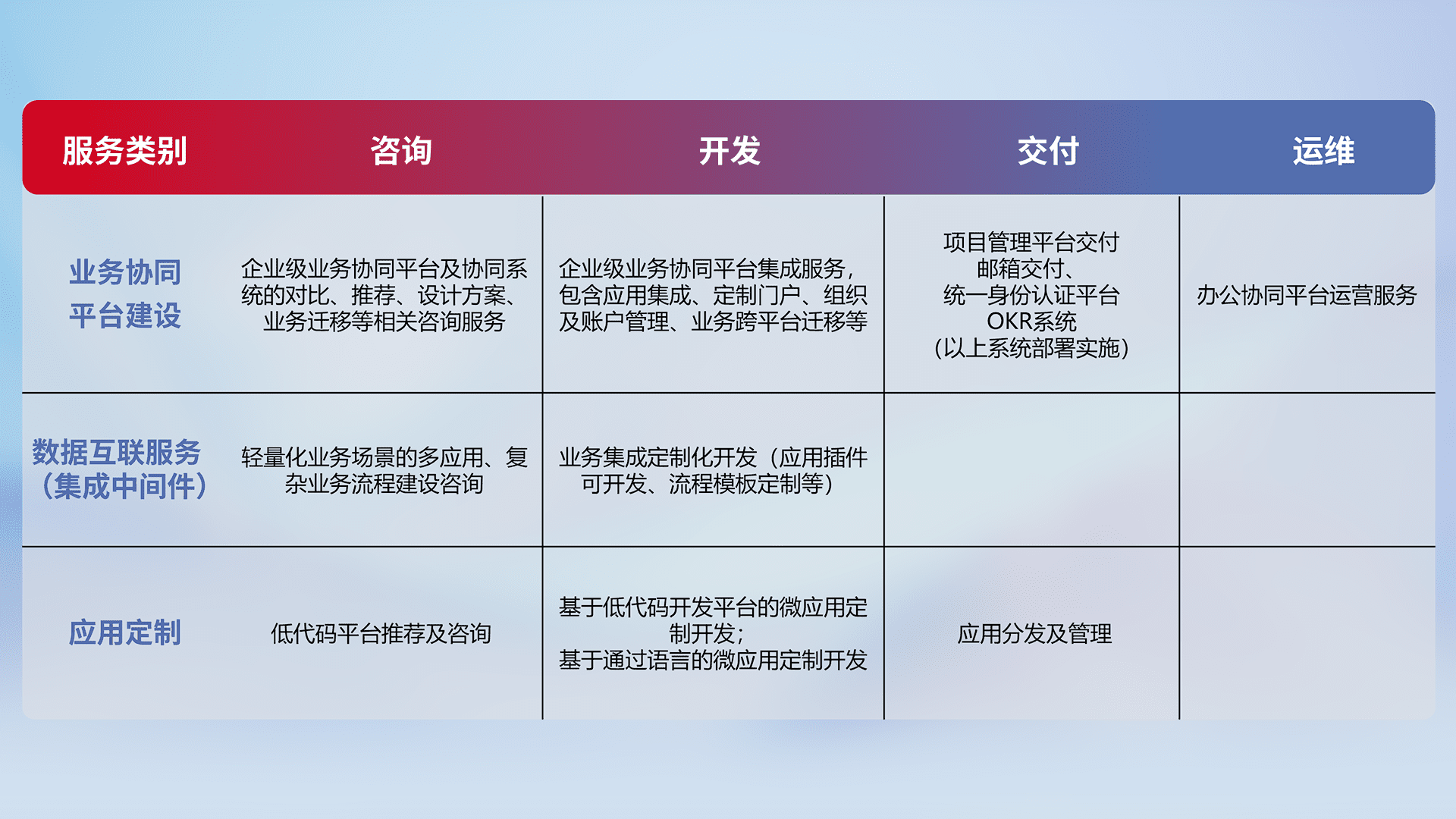 针对钉钉、、企微、、、IDaas等平台级产品提供产品的规划、、、、方案、、交付、、、定制化开发等服务,,实现如统一协同办公、、、、智能客户服务、、、混合会议管理、、、智能数据查询、、、等业务场景,,实现数字化转型。。