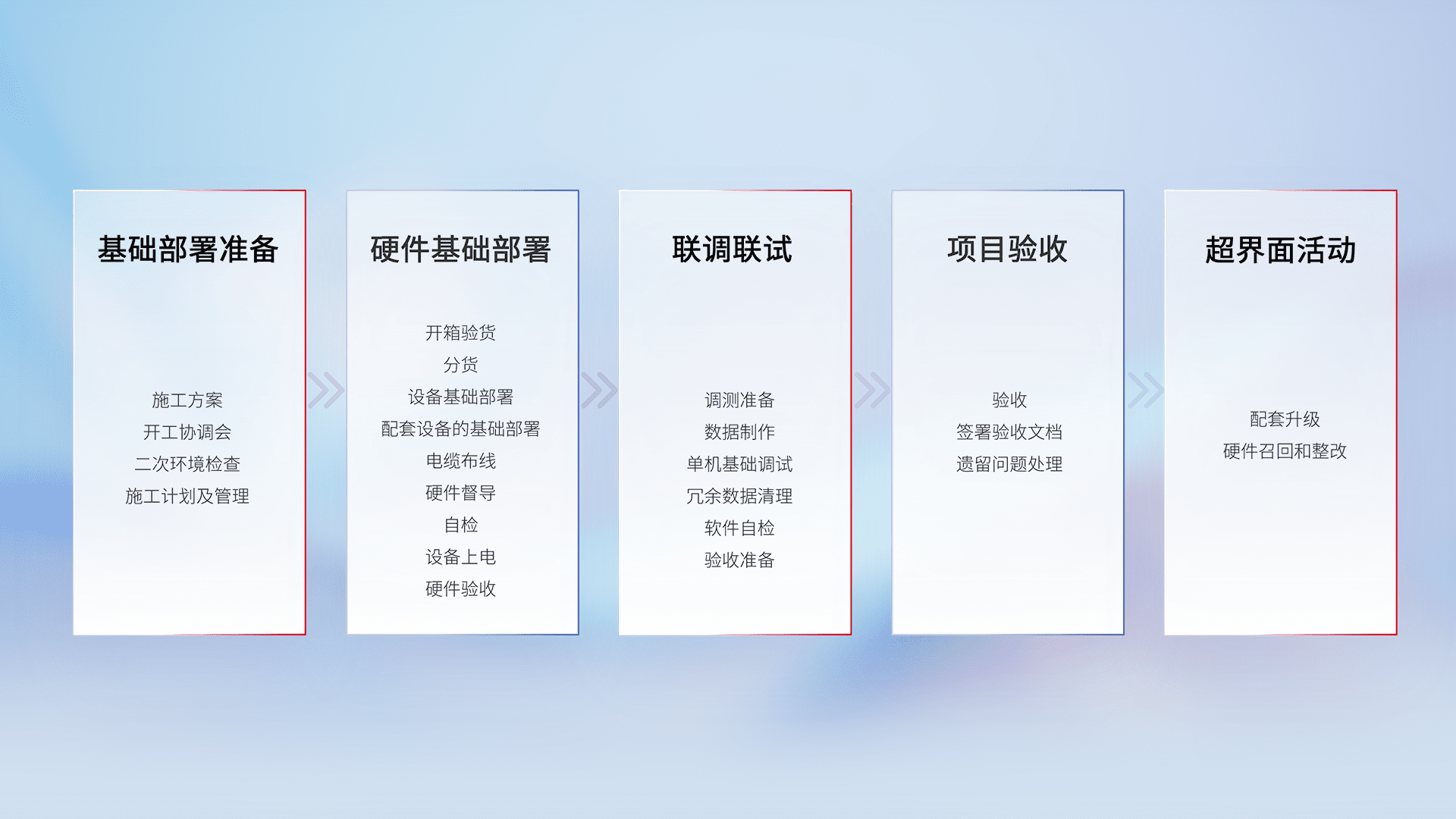 从基础部署准备、、、硬件基础部署、、、联调联试、、、项目验收、、、、越界面活动的全过程可追溯,,,,保证施工质量和进度。。。